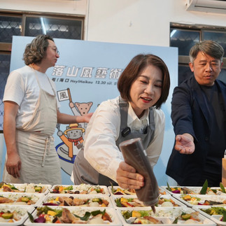 周縣長指出,過去常被形容是遠的要命的美術館,如今有越來越多藝術家選擇到此展出,今年特別邀請兩位日本料理職人—對中剛大、森本由美,與車城社區長輩合作,為屏東量身研發限定「海口食堂」料理,她也分享,下午走訪社區跟老師、長輩們一同製作便當時,選用雞肉、月桃葉、蘿蔔、牛港鰺、香草葉,以及社區自製的豆腐乳醬與豆鼓醬等食材,充分展現在地飲食特色。