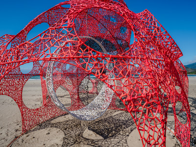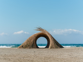 沙灘區則展出8件各具特色作品,包括李蕢至《風逕》以竹構形成S行動線,如風掠過的痕跡;曾煜譡《風之間》立於沙丘像捕風容器;鄭元東《風的容器》以極簡造型呈現風的流動;來自墨西哥的Lua《紅珊瑚之亭》邀請觀者穿梭其中感受海洋氣息。