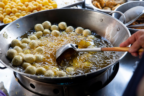 夾著厚厚芋頭餡的圓餅經過油炸,外皮薄脆內餡軟綿,甜而不膩,不論大人小孩都想來上一顆的古早味炸物。
