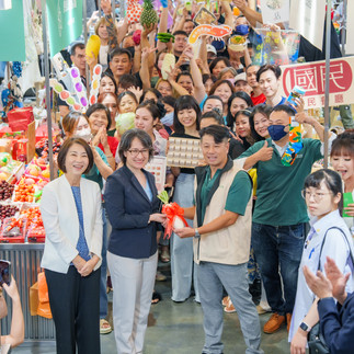 隨後開幕典禮上,經濟部何次長送上象徵生意旺旺的鳳梨,周縣長則是準備金幣禮籃,都是寓意賺大錢的好兆頭。周縣長還逐一巡攤加油打氣,之前試營運期間,她就多次到西市場關心,幾乎每一攤都如數家珍。