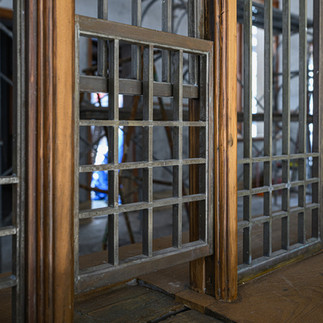 從去年5月進場至今,里港郵便局一步步被修復回來。牆面下方以洗石子工法施做的收邊裝飾略有毀損,現已復原。辦公廳舍的窗戶上緣,開了半月形的通氣窗,是建築特色之一。當年全以洗石子工法修飾,如今全復舊如舊。廳舍裡的木作櫃檯、銅製格柵,以及挑高地板下可通風的鐵製格柵亦已修復。