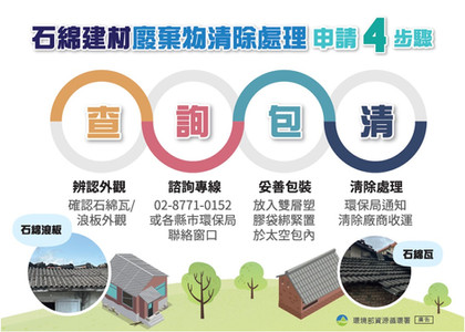 環保局建請縣民呼應政府美意,多加善用本項免費措施,將石綿廢棄物從環境中移除,切勿貪圖一時方便隨意棄置含石綿建材廢棄物,以免造成石綿纖維在環境中流布、遺害後代子孫。石綿建材廢棄物清理補助申請文件可至屏東縣政府環保局官網下載,民眾若有申請文件填寫相關問題,可電洽環保局08-7351911分機604,由專人提供協助。
