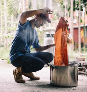 那天到黃琬婕內埔上樹村老家看他們染布,鐵皮屋裡阿婆正剪收檳榔,讓她看了想起舊時光笑說:「哈!我小時也做過喔,剪一大簍好像一百塊。」阿婆說:「現在更不值了,一粒才八分……」附和聲中王一帆已起鍋滾水準備染布,鍋中水汽蒸騰時,開始翻攪染布,空氣中剎時飄散奶香及青草香,彷彿大廚掌鍋的特有鑊氣,正是檳榔子染特有的氣味。