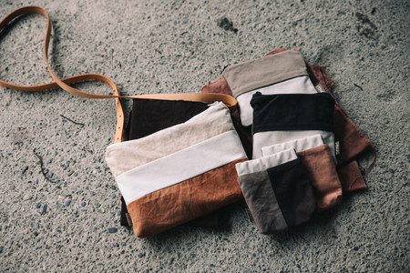 染布起鍋晾乾後,換黃琬婕接手。從夜市擺攤到現在,她仍是自己打板縫包。她設計的包款外型簡單,從肩背包到旅行袋,都沒夾層無內袋,攤開來看是不同色塊的組合,但隨著背帶調整及長短,同個包卻可變化出水桶包、托特包等不同包款。